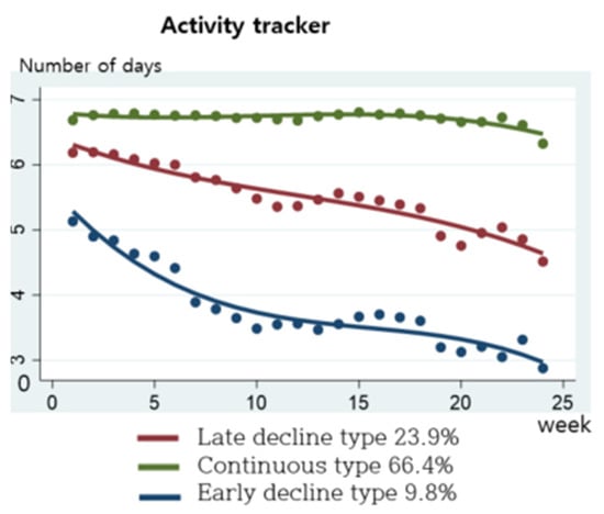 The mHealth service recommends linking with the activity tracker mobile phone app at least five times a week (Figure 7). From the results of categorizing weekly interlocking practices, 66.4% were the continuous type, linking an average of seven times a week; 23.9% were the late decline type, practicing an average of five times per week and then gradually decline; and 9.8% were the early decline type.