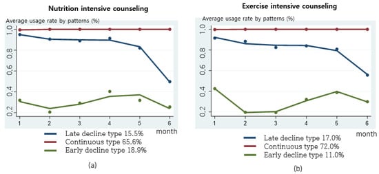 Nutrition intensive counseling and exercise intensive counseling were provided once a month (Figure 8). The distribution of nutrition intensive counseling practice was as follows: 65.6% for the continuous type, 15.5% for the late decline type, and 18.9% for the early decline type. For exercise intensive counseling, the distribution was 72.0% for the continuous type, 17.0% for the late decline type, and 11.0% for the early decline type. For the practice patterns of intensive counseling, the late decline type started to decline at five months. For the early decline type, practice remained low for two to three months. For the early decline type, practice remained low for two to three months, and after intermediate face-to-face counseling (three months), intensive counseling increased at four to five months and then decreased again.