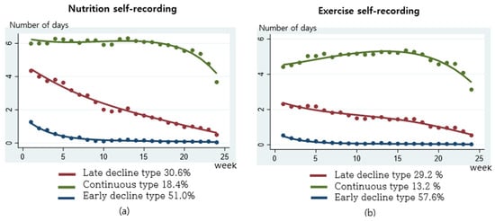 Behavior skills were assessed using weekly nutrition self-recording and exercise self-recording (Figure 9). Nutrition self-recording was 18.4% for the continuous type, 30.6% for the late decline type, and 51.0% for the early decline type. Exercise self-recording was 13.2% for the continuous type, 29.2% for the late decline type, and 57.5% for the early decline type. Compared to other practices, the early decline type was the highest, followed by the late decline type and the continuous type.