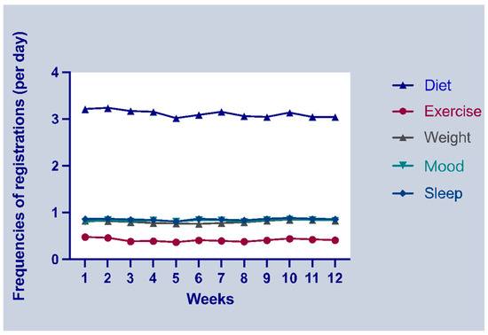 During the first week, participants logged their diet, exercise, weight, mood, and sleep an average of 3.21, 0.48, 0.82, 0.80, and 0.86 times per day, respectively (Table 2). Figure 1 illustrates the weekly frequency of each item over the three-month period.