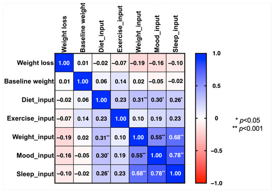 Figure 2 illustrates the correlation matrix between the number of app inputs per day during the first week and weight loss over three months. No significant correlations were identified between app input frequency and weight loss. The most notable positive correlation was observed between mood and sleep inputs during the first week (ρ = 0.78; p < 0.001).