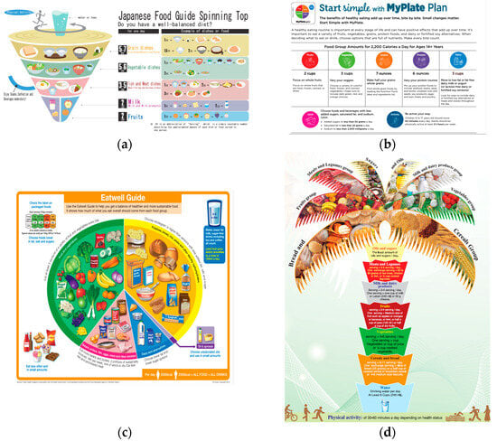 In the UK, the NHS proposed the Eat Well Guide (Figure 2c) [32], which comprises five sections: “Fruit and vegetables”, “Beans, pulses, fish, egg, meat, and other proteins”, “Potatoes, bread, rice, pasta, and other starchy carbohydrates”, “Dairy and alternatives”, and “Oil and spreads”. In particular, the fruit and vegetable section, which recommends five portions per day, is well-as the “5 a day guideline”. The principle underlying the UK’s guideline can be described as not requiring to be achieved during every meal. Achieving a good balance within a day or week is important. Therefore, the daily standard values are not stringently defined, except in the “Fruit and vegetable” section. In the protein section, two portions of fish, one of which is oily fish, per week, and consuming as little red meat as possible are recommended. In the carbohydrate section, the benefits of whole grains are explained. Moreover, the guideline clarifies that carbohydrates have fewer calories than fats and includes a consideration of excessive concerns about weight gain. Independent of the five main sections, the guideline recommends drinking plenty of fluids (6 to 8 cups) daily. This unique point differs from the Japanese and U.S. guidelines mentioned above. Additionally, fruit juice is recommended not to exceed 150 mL/day.