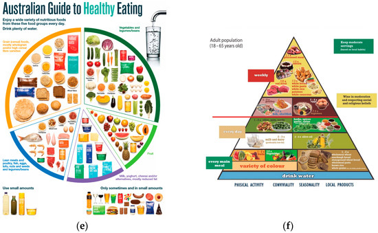 In Australia, the NHMRC established the Australian Guide for Healthy Eating (Figure 2e) [35]. This was similar to that of the Japanese Food Guide Spinning Top, but the recommended amount differed slightly (Table 2). One of the unique features of this guideline is the recommendation of one or two meat-free meals per week.