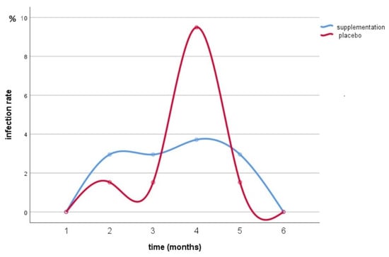 As described in Table 3, just one infection on one occasion was detected during the follow-up in the supplementation group, while six UTI infections occurred during the same follow-up period in the placebo group.