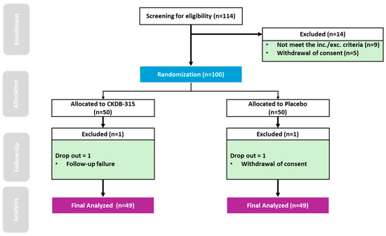 A flowchart of the study protocol is shown in Figure 1. Of the 114 screened participants, 100 were randomized into the CKDB-315 (n = 50) and placebo (n = 50) treatment groups. All randomized participants were included in the safety analysis. Of these, 98 were included in the FAS after excluding two participants owing to efficacy assessment omissions (CKDB-315 group: n = 49, placebo group: n = 49). The baseline demographic characteristics were balanced, with no significant differences observed between groups (Table 1).