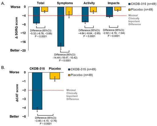 Comparison of the mean changes from baseline to 12 weeks in (A) SGRQ scores (Total, Symptoms, Activity, and Impacts) and (B) CAT total score between the CKDB-315 group and the placebo group using the least squares (LS) method. The p-values are calculated from ANCOVA tests that have been corrected for baseline values. SGRQ is for St. George’s Respiratory Questionnaire, CAT stands for Chronic Obstructive Pulmonary Disease Assessment Test, and CI stands for confidence interval.