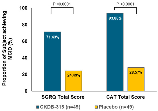 A comparison was made between the CKDB-315 group and the placebo group to determine the proportion of participants who reached the minimum clinically important difference (MCID) for changes in the SGRQ total score and CAT score after 12 weeks. The minimum clinically important difference (MCID) was defined as a decrease of 4 points from the initial value for the St. George’s Respiratory Questionnaire (SGRQ) total score and a decrease of 2 points from the initial value for the COPD Assessment Test (CAT) total score. The comparison between the groups was analyzed using Pearson’s chi-square test. MCID is an acronym for Minimal Clinically Important Difference. SGRQ stands for St. George’s Respiratory Questionnaire, while CAT is an abbreviation for Chronic Obstructive Pulmonary Disease Assessment Test.