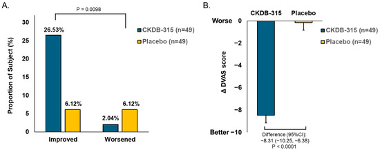 A significant difference between groups was observed in the categorized change in mMRC scores from baseline to week 12 (p = 0.0098). The number of participants with improved mMRC scores was higher in the CKDB-315 group than in the placebo group (26.53% vs. 6.12%). However, that of participants with worsening scores was lower in the CKDB-315 group than in the placebo group (2.04% vs. 6.12%) (Figure 4A). Similarly, the mean LS change in the dyspnea visual analog scale (DVAS) significantly improved from baseline to 12 weeks in the CKDB-315 group compared with that in the placebo group (p < 0.0001) (Figure 4B).