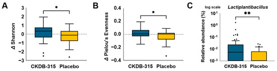 Comparison of the alterations in the intestinal microbiota between the CKDB-315 group (n = 48) and the placebo group (n = 45) from baseline to 12 weeks. (A) Assessment of Shannon’s diversity index; (B) evaluation of Pielou’s evenness index; (C) determination of the relative abundance of the Lactiplantibacillus genus. The comparison between groups was examined using the Wilcoxon rank sum test. A single asterisk (*) indicates significant difference at p < 0.05, and double asterisk (**) indicated significant difference at p < 0.001.