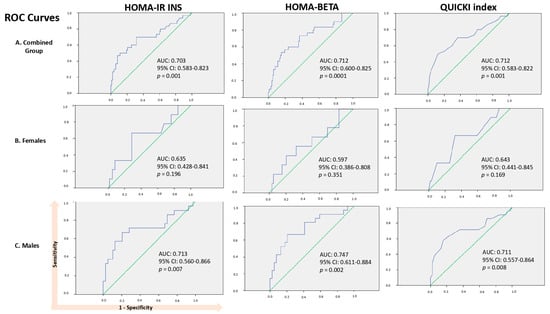 Based on the significant differences (p < 0.05) observed among the study groups in terms of HOMA-IR INS, HOMA-BETA, and QUICKI presented in Table 2, we proceeded to evaluate their diagnostic accuracy through receiver operating characteristic (ROC) curve analysis and calculation of the AUC, separately in the combined group (females + males), females, and males, as illustrated in Figure 1. In the combined group, the statistically significant p-values (p < 0.05) and AUC suggest that HOMA-IR INS (AUC: 0.703; 95% CI: 0.583–0.823, p = 0.001), HOMA-BETA (AUC: 0.712; 95% CI: 0.600–0.825; p = 0.0001), and QUICKI (AUC: 0.712; 95% CI: 0.583–0.822; p = 0.001) possess discriminatory power in distinguishing between subjects with and without MetS, indicating moderate diagnostic accuracy. Furthermore, when the groups were stratified by sex, the AUC tended to decrease in the female group and increase in the male group (HOMA-IR INS AUC of 0.703 for the combined group vs. 0.635 for females and 0.713 for males; HOMA-BETA AUC of 0.712 for the combined group vs. 0.597 for females and 0.747 for males), except for the QUICKI index (AUC of 0.712 for the combined group vs. 0.643 for females and 0.711 for males). Interestingly, statistical significance was observed exclusively in the male group regarding the accuracy of the test and its ability to differentiate between subjects with and without MetS (p = 0.007 for HOMA-IR INS, p = 0.002 for HOMA-BETA, and p = 0.008 for QUICKI index).