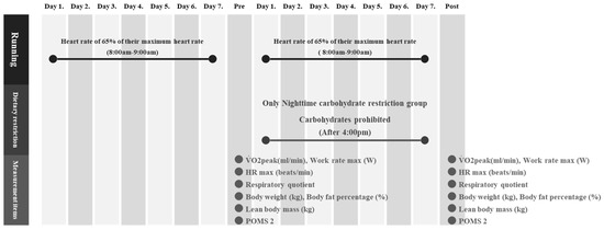 In the first week, no dietary restrictions were imposed on either group, and the participants consumed their habitual diet. Calorie and carbohydrate intakes were measured and recorded using an AI health app (Calomama, Link, and Communication). Daily calorie and carbohydrate intakes in the second week were calculated by dividing the total intakes from the first week by seven. Although only the nighttime carbohydrate restriction group was prohibited from consuming carbohydrates after 4:00 p.m., the daily calorie and carbohydrate intakes were the same in both groups. All participants were also asked to refrain from consuming alcohol or caffeine during the experimental period.