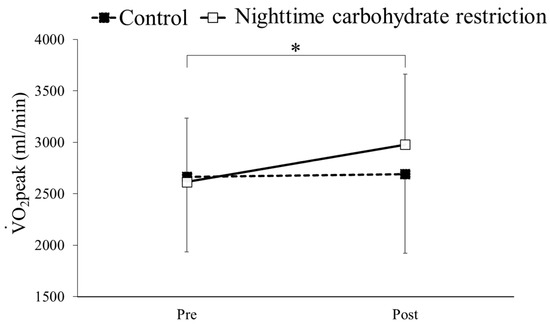 Comparison of O2peak in a maximal exercise test before (Pre) and after (Post) intervention in a control group and nighttime carbohydrate restriction group. * Significant difference.