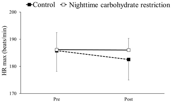 The HRmax results before and after the intervention in the nighttime carbohydrate restriction and control groups are shown in Figure 3. Two-way ANOVA detected no interaction between the group and time, and there were no significant differences in HRmax results after the intervention versus before or between groups.