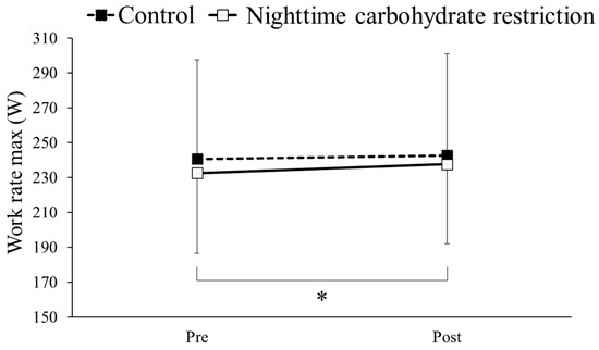The work rate max results before and after the intervention in the nighttime carbohydrate restriction and control groups are shown in Figure 4. Two-way ANOVA detected no significant interaction effect between the group and time. When the main effect of time was tested, a significant difference was observed. Multiple comparison analysis showed a significantly higher work rate max after the intervention compared to before the intervention in the nighttime carbohydrate restriction group (p < 0.05).