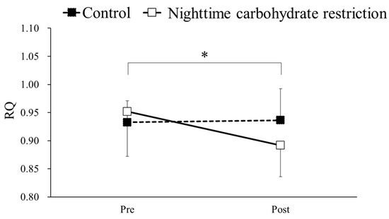 The RQs before and after the intervention in the nighttime carbohydrate restriction and control groups are shown in Figure 5. Two-way ANOVA detected a significant interaction between the group and time (F = 7.04, p < 0.05). A simple main effects test was conducted, and a significant difference in RQs before and after the intervention was observed in the nighttime carbohydrate restriction group. Multiple comparison analysis showed a significantly lower RQ after the intervention compared to before the intervention (p < 0.05).