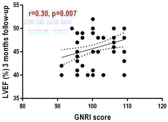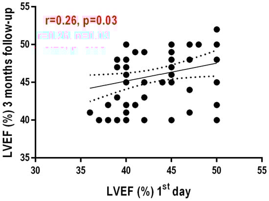 The GNRI score values showed a moderately positive, significant correlation with LVEF at 3 months post infarction (r = 0.310, p = 0.008)—Figure 1. Another weakly positive but statistically significant correlation exists between LVEF at 1 day post infarction and LVEF at 3 months post AMI (r = 0.259, p = 0.027)—Figure 2.