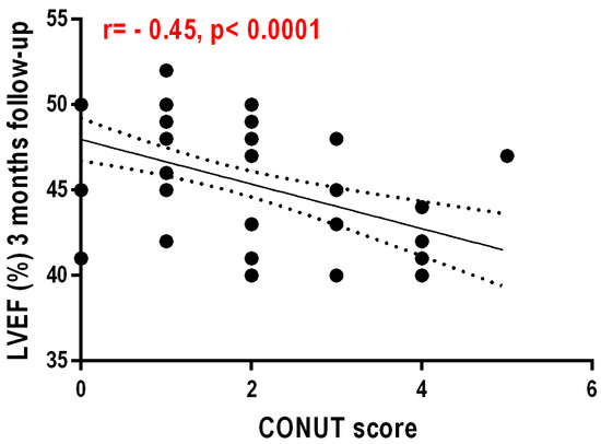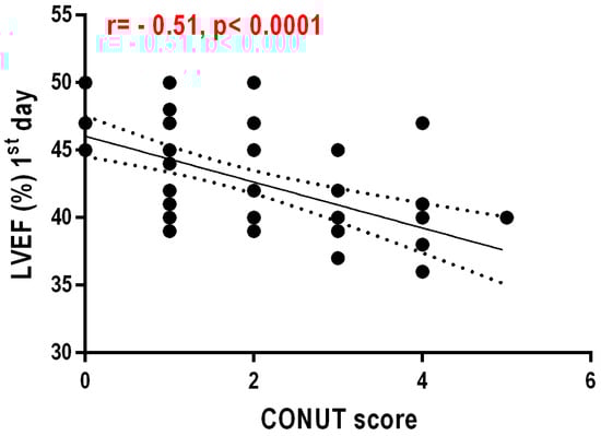 Regarding the CONUT values and the correlation with the GNRI score values at 3 months after AMI, these are negative and statistically insignificant (r = −0.087, p = 0.464). Another weak but still statistically significant negative correlation exists between the CONUT score and LVEF at 1 day after AMI (r = −0.51, p < 0.0001)—Figure 3. CONUT values showed a weak but statistically significant negative correlation with LVEF at 3 months post infarction (r = −0.453, p < 0.0001)—Figure 4.