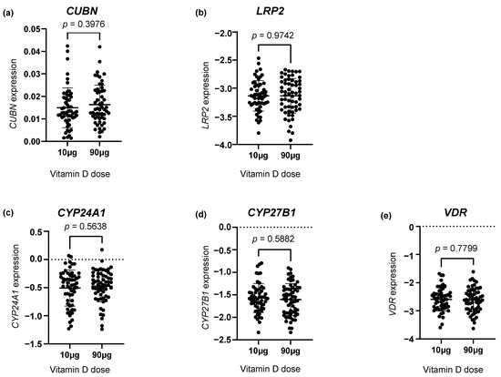 Investigating the gene expression of the vitD-related genes CUBN, LRP2, CYP24A1, CYP27B1 and VDR, we found no statistically significant difference between the two vitD dosing groups (Figure 1a–e).