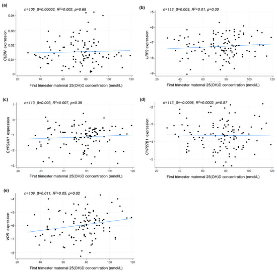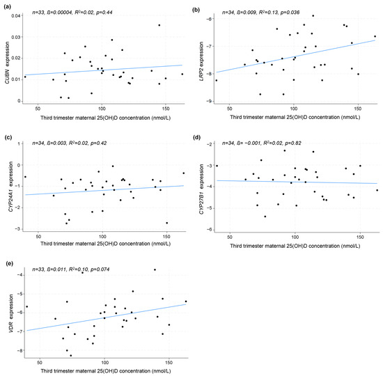 In a subset of the participants, it was possible to analyze gene expression in relation to maternal 25(OH)D concentration in the third trimester (n = 34). A linear regression model revealed that maternal third-trimester 25(OH)D concentrations were positively correlated with the expression of LRP2 (p = 0.036), but not CUBN (p = 0.44), CYP24A1 (p = 0.42), CYP27B1 (p = 0.82) or VDR (p = 0.074) (Figure 2a–e).