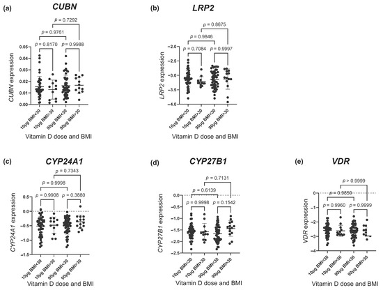 The gene expression of (a) CUBN, (b) LRP2, (c) CYP24A1, (d) CYP27B1 and (e) VDR according to the vitamin D dosing group (10 µg vs. 90 µg) and BMI group (> and <30 kg/m2). The error bars in the figure illustrate the mean expression ± SD. p-values were calculated using a one-way ANOVA. A logarithmic transformation of LRP2, CYP24A1, CYP27B1 and VDR expression values was performed to achieve a Gaussian distribution of the data. Note that CYP27B1 expression was under the detection limit in 46 placental samples of which 28 were from the 90 µg vitamin D group and 18 from the 10 µg vitamin D group. CUBN, LRP2 and VDR expression was standardized to the geomean of CycA and HPRT, and CYP24A1 and CYP27B1 expression was standardized to the expression of HPRT. BMI, body mass index.