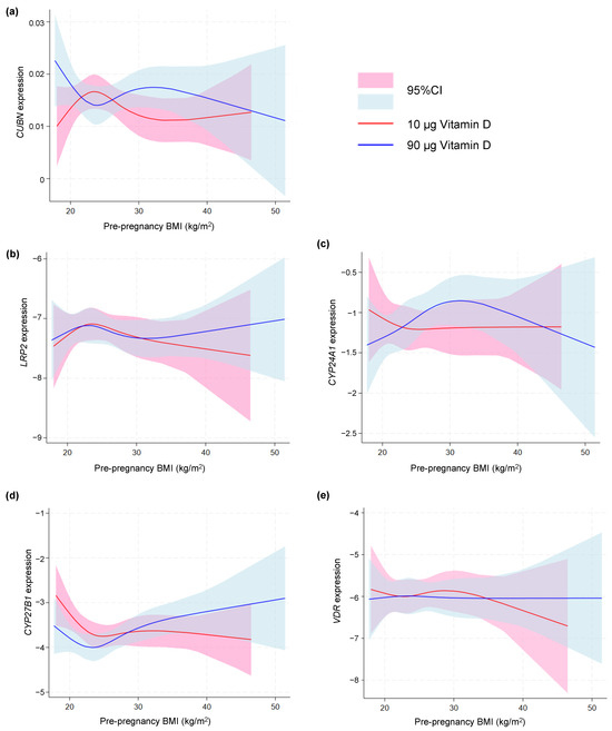 As depicted in Figure 3, no difference was found in the gene expression of any of the vitD-related genes among women with a pre-pregnancy BMI < 30 and >30 kg/m2. To further nuance the possible effect of BMI, we used a spline model to visualize any tendency toward an effect of pre-pregnancy BMI. This approach showed a tendency of an increased CUBN expression with increasing BMI in the 90 µg vitD group (Figure 4a). No differences with regard to LRP2 expression were observed (Figure 4b). For CYP24A1, the spline model approach indicated a higher CYP24A1 expression among overweight or obese women in the 90 µg vitD group with no apparent response to increasing BMI in the 10 µg vitD group (Figure 4c). With regard to CYP27B1, the 90 µg vitD group appeared to have a lower expression of CYP27B1 compared to the 10 µg vitD group in normal and overweight pregnancies, but at a BMI of 29 kg/m2, this correlation was reversed, and CYP27B1 expression was higher in the 90 µg vitD group (Figure 4d). For VDR, the spline model did not point toward an association between pre-pregnancy BMI and placental VDR expression (Figure 4e).