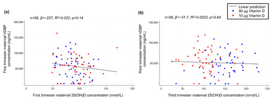 Linear correlations between (a) maternal-serum VDBP and 25(OH)D concentration in the first trimester and (b) maternal-serum VDBP and 25(OH)D concentration in the third trimester. VDBP, vitamin D-binding protein; 25(OH)D, 25-hydroxy vitamin D.