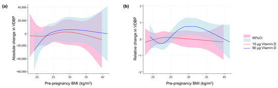 VDBP in maternal blood in relation to maternal body weight. Spline models of the association between maternal pre-pregnancy BMI and (a) the absolute change and (b) relative change in maternal-serum VDBP concentration from the first to third trimester in relation to and stratified for the vitamin D dosing group (10 µg vs. 90 µg). BMI, body mass index; VDBP, vitamin D-binding protein; 95% CI, 95% confidence interval.