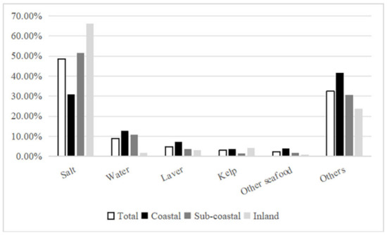 While laver and kelp are known for their high iodine content, their consumption frequency and quantity among the surveyed individuals were relatively low [30], resulting in a limited contribution to dietary iodine. Despite other forms of seafood being consumed more frequently, their iodine content is not substantial, thus limiting their contribution to dietary iodine. Although residents in coastal areas consumed more seafood than those in subcoastal and inland areas, the dietary iodine intake in coastal regions was lower than that in subcoastal and inland areas, suggesting that seafood is not the primary source of dietary iodine. Furthermore, an analysis of the entire population, iodized salt consumers, and non-iodized salt consumers indicated that laver, kelp, and other seafood were not the main contributors to dietary iodine. This finding is consistent with that of research in Xinjiang [21], Tianjin [29], and other regions, confirming that laver, kelp, and other seafood are not the primary sources of dietary iodine.