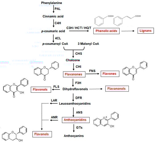 Schematic representation of the polyphenol biosynthetic pathway, with the main classes of polyphenols. PAL, phenylalanine ammonia lyase; C4H, cinnamic acid 4-hydroxylase; C3H, p-coumarate 3-hydroxylase; HCT, hydroxycinnamoyl CoA shikimate/quinate hydroxycinnamoyl transferase; HQT, hydroxycinnamoyl CoA quinate hydroxycinnamoyl transferase; 4CL, 4-coumarate coA ligase; CHS, chalcone synthase; CHI, chalcone isomerase; FNS, flavone synthase; F3H, flavanone 3-hydroxylase; FLS, flavonol synthase; DFR, dihydroflavonol reductase; LAR, leucoanthocyanidin reductase; ANS, anthocyanidin synthase; ANR, anthocyanidin reductase; GTs, glycosyltransferases.