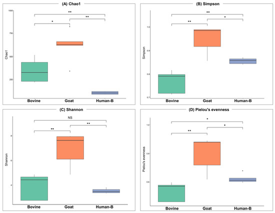 Bovine, goat, and human mature milk microbiome alpha diversity. (A) Chao1, (B) Simpson, and (C) Shannon indices and (D) Pielou’s evenness. Statistical significance (Wilcoxon test); NS p > 0.05, (*) p < 0.05, (**) p < 0.001.