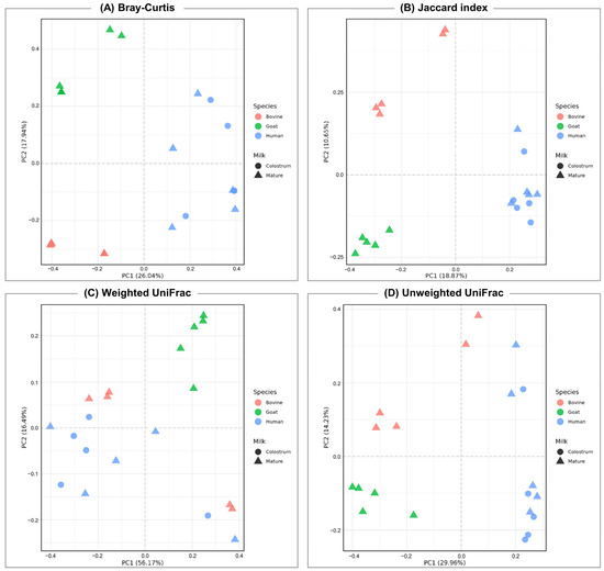Principal coordinates analysis (PCoA) plot based on the (A) Bray-Curtis dissimilarity matrix (B) Jaccard index, (C) unweighted UniFrac distance, and (D) weighted UniFrac distance matrix, calculated for genus-level abundances and depicting patterns of beta diversity for microbial communities in milk.