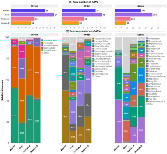 A taxonomic assignment of amplicon sequence variants (ASVs) detected in milk samples from bovine, goat, and human samples (human-A: colostrum milk, human-B: mature milk) is presented in Figure 3. At the phylum level, as depicted in Figure 3A, goat milk exhibited the highest diversity, with a total number of 24 ASVs, followed by bovine milk with 19 ASVs, human colostrum milk with 13 ASVs, and human mature milk with 11 ASVs. At the order level, goat milk showed again the greatest diversity with 93 ASVs, while bovine milk exhibited 78 ASVs, human colostrum milk 51 ASVs, and human mature milk 39 ASVs. In total, 302 genera were detected in goat milk, 207 in bovine milk, 124 in human colostrum, and 88 in human mature milk.