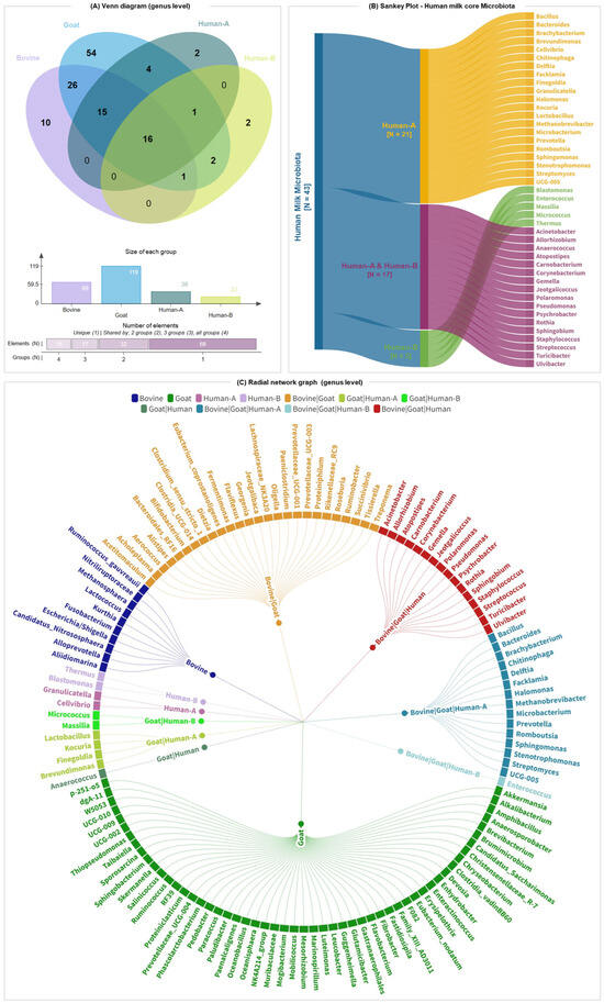 Comparison of core microbiota in bovine, goat, and human milk (colostrum and mature) at the genus level. (A) Venn diagram illustrating the numbers of shared and unique amplicon sequence variants between three species. (B) Sankey plot depicting the genera that are detected consistently in human breast milk samples in timepoint A (human-A: colostrum milk) and timepoint B (human-B: mature milk). (C) Radial network graph depicting genus-level overlap of bacterial communities in the milk microbiota of bovine, goat, and human milk. The detection rate threshold was set to 80% (4/5 samples).