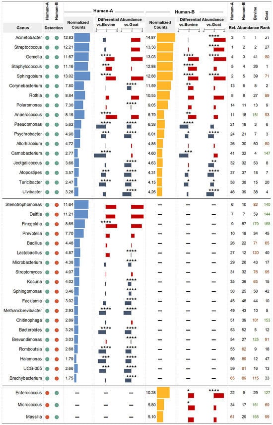 Comparative analysis of core milk bacterial abundance between humans and local dairy animals. Bacterial genera that met the detection rate threshold (80%; detected in at least four out of five samples) are depicted with green dots, whereas those that did not meet the threshold are indicated with red dots. Differential abundance results for genera that did not meet the detection threshold were not considered and are marked with a dash (“-”). Results with an adjusted p-value less than 0.05 were considered statistically significant (four stars: p < 0.0001, three stars: p < 0.001, two stars: p < 0.01, one star: p < 0.05, no stars: p ≥ 0.05). Relative abundance rank is indicated by color: high (1–60) in black, medium (61–120) in red, and low (>120) in green.