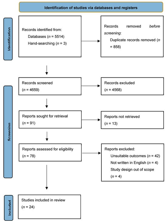 A total of 24 studies met the inclusion criteria and were included in this review (Figure 1). Based on the quality assessment, 13 studies received a positive rating, and 11 received a neutral rating.