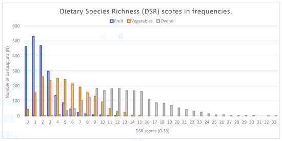 In total, 157 unique species were identified. Cow (Bos taurus), wheat (Triticum aestivum), onions (Allium cepa) and cabbages (Brassica oleracea) were the most frequently consumed species. The overall DSR scores per participant ranged between 2 and 33 over two measurement days (Figure 1). Most participants consumed one or two different fruit species over two measurement days. In total, 22% of the participants did not consume any fruit species over two measurement days and therefore had a DSR fruit score of ‘0’ [zero] (DSR fruit min.0–max.12). For vegetables, most participants consumed between two to four different vegetable species over two measurement days. Only 2% of the sample did not consume any vegetable species over two measurement days and therefore had a DSR vegetables score of ‘0’ [zero] (DSR vegetables min.0–max.15).