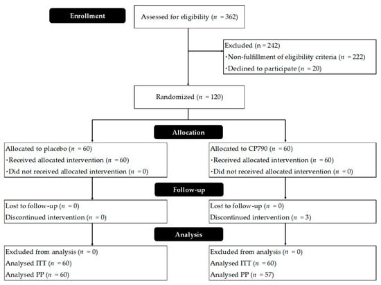 In total, 120 participants were recruited according to the inclusion criteria and assigned to the two groups in a 1:1 ratio. Figure 2 shows a flow diagram of the study participants. Three subjects from the CP790 group exited the study for personal reasons, and 117 completed it. Finally, data from 117 subjects were used for the efficacy analysis. The safety analyses included 120 participants who had received the test beverage at least once. The baseline characteristics of participants who completed the study are shown in Table 1. No significant differences were found in age, sex, weight, height, BMI, defecation frequency, or stool consistency. High compliance was attained in this study; the frequencies of CP790 and placebo beverage consumption (%) were 99.94 ± 0.47 for CP790 and 100.00 ± 0.00 for placebo (mean ± standard deviation). The results of the BDHQ dietary survey showed no significant changes in dietary intake in either group.