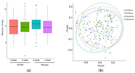 Fecal samples were collected at home in a container containing guanidine thiocyanate solution. The collected samples were stored at 4 °C before DNA isolation. The DNA was isolated using the bead-beating method. The fecal samples were pulverized using a ShakeMaster® NEO (Bio Medical Science, Tokyo, Japan), left at 65 °C for 10 min, and centrifuged at 12,000× g for 2 min. Genomic DNA was extracted from the collected centrifugal supernatant using a Lab-Aid824s DNA Extraction Kit (ZEESAN, Xiamen, China). 16S rRNA gene (V3-V4) amplicon sequencing was performed by Bioengineering Lab. Co., Ltd. (Sagamihara, Japan). dsDNA libraries were prepared using a two-step tailed PCR method. A Bio Tek Synergy H1 plate reader (Agilent, Santa Clara, CA, USA) and QuantiFluor dsDNA System (Promega, Madison, WI, USA) were used to measure library concentrations. Library quality was evaluated using a Fragment Analyzer (Agilent) and a dsDNA 915 Reagent Kit (Agilent). Paired-end 2 × 300 bp sequencing on the Illumina MiSeq® platform was performed using the MiSeq Reagent Kit v3 (Illumina, San Diego, CA, USA). The 16S rRNA gene sequencing data and metadata were deposited in the DDBJ BioProject database (accession number: PRJDB18202). The sequences of all samples were processed using QIIME2 (v.2022.11). The DADA was used to exclude chimeric and noise sequences. The taxonomic assignment of the sequences was accomplished using SILVA 138. The protocols for amplicon libraries have been described in previous studies [,]. Alpha diversity metrics (Shannon’s entropy, Chao1, Pielou’s evenness, Faith’s PD, and observed features) were calculated to evaluate microbiome richness and evenness among the CP790 and placebo groups. The groups were compared using the Kruskal–Wallis test. Beta diversity was determined using the unweighted UniFrac distance metric and principal coordinate analysis (PCoA). The groups were compared using PERMANOVA. Phylogenetic Investigation of Communities by Reconstruction of Unobserved States (PICRUSt2) [] provided predictive functional profiling based on 16S rRNA gene amplicon analysis.
