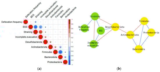 (a) Matrix of Spearman’s correlation coefficients. Color intensity indicates magnitude of correlation (* p < 0.05). Blue denotes a negative correlation and red denotes a positive correlation. The correlation coefficient values are presented in Table S3. (b) Correlation network. The network was visualized in Cytoscape. The nodes are microbiota (yellow) and bowel habits (green). Blue edges denote a significant negative and red edges denote a significant positive correlation.
