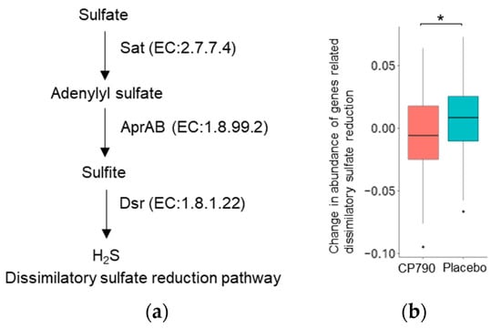 To compare the abundance of hydrogen sulfide production-related genes between the two groups, we conducted PICRUSt2 analysis using the relative abundance of the 16S rRNA gene amplicon data. Because many hydrogen-sulfide-producing bacteria belong to Desulfobacterota, we calculated the abundance of dissimilatory sulfate reduction-related genes. The total abundance of these genes in the CP790 group was significantly decreased compared to that in the placebo group (p = 0.025) (Figure 5).