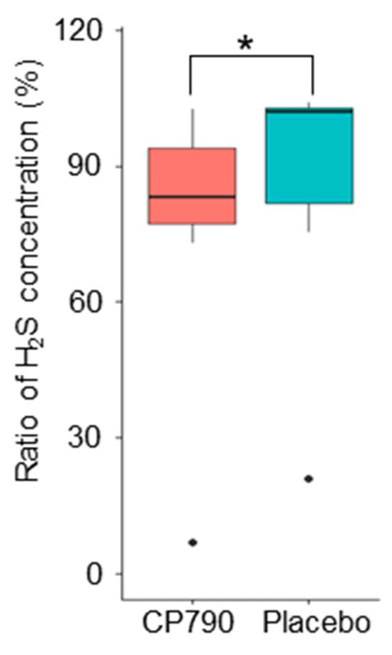 We investigated the inhibitory effect of CP790 on hydrogen sulfide production using an in vitro assay. The hydrogen sulfide concentrations of in vitro assay with fermented milk and placebo were 52.1 ± 12.8 and 60.5 ± 15.7 μM (mean ± standard error), respectively (Table 5). The ratio of hydrogen sulfide concentration in the culture supplemented with CP790 was significantly lower than that in the placebo (p = 0.043) (Figure 6). The in vitro study results did not contradict the predictions made from the results using PICRUSt2 analysis.