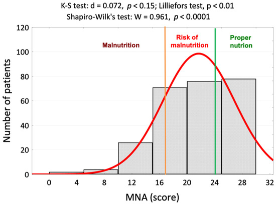 Histogram of the nutritional status assessments of 257 lung cancer patients against the background of a normal distribution and results of normality tests. Abbreviations: MNA—Mini Nutritional Assessment.