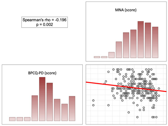 Correlation diagrams between nutritional statuses and the doctors’ influence on patients’ beliefs regarding their pain control. Abbreviations: MNA—Mini Nutritional Assessment; BPCQ—Beliefs about Pain Control Questionnaire.