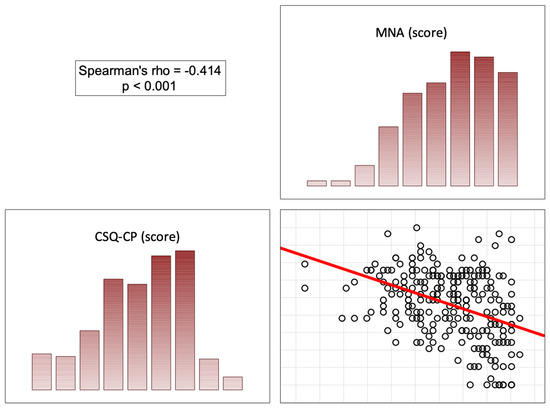 Correlation diagrams between nutritional statuses and the doctors’ influence on patients’ coping strategies (catastrophizing). Abbreviations: MNA—Mini Nutritional Assessment; CSQ-CP—Coping Strategies Questionnaire (catastrophizing).