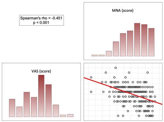 Correlation diagrams between nutritional statuses and the doctors’ influence on patients’ level of experienced pain. Abbreviations: MNA—Mini Nutritional Assessment; VAS—Visual Analog Scale.