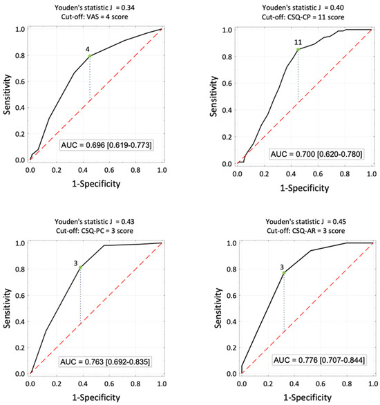 Logistic regression was employed to predict malnutrition or its risk based on BPCQ, CSQ, and VAS scores. Patients with an MNA score of <23 were classified as at risk of malnutrition (Y = 1). Quantitative variables were transformed into binary variables based on cut-off values determined by the ROC curve analysis (Figure 6). The results of the ROC curve analysis are shown in Table 6.