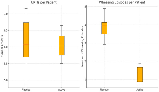 Patients in the placebo group showed a total of 130 episodes of URTI symptoms, with a median (IQR) of 6.03 (2.31) episodes per patient in the follow-up period and a mean of 6.1 days/month with symptoms; in the active group, a total of 117 episodes of URTI symptoms were reported, with a median (IQR) of 6.05 (1.36) episodes per patient in the follow-up period and a mean of 4.9 days/month with symptoms. No significant differences between the two groups in terms of number and median of episodes per patient were reported (Figure 1) (Table 1).