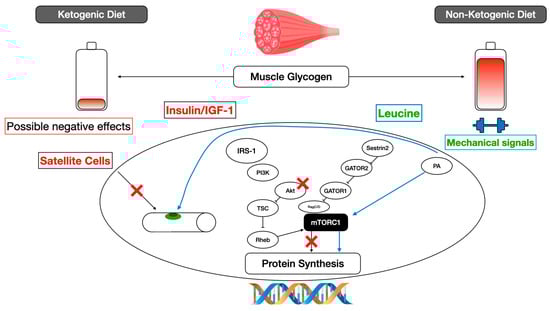 In our previous work [], we reported that KD can be an alternative for increasing fat free mass (FFM) in advanced participants trained in RT, as energy surplus is generated. However, it does not seem to be the best option for muscle hypertrophy, due to the effect of satiety and the lack of adherence that is generated. Figure 1 shows how strength exercise can activate protein signaling pathways through mTORC1 or satellite cells. However, when a KD is applied, the signaling chains can be inhibited in Akt or in the activation of satellite cells themselves. Furthermore, insulin or insulin growth factor does not seem to optimize its function under a ketogenic condition []. On the other hand, KDs generate a very high concentration of beta-hydroxybutyrate, and it has been reported that this metabolite can reduce leucine oxidation, thereby favoring the preservation of muscle mass []. Interestingly, beta-hydroxybutyrate has been shown to have neuroprotective effects, specifically in BV2 cells, inducing microglial polarization, significantly reducing the expression levels of the pro-inflammatory cytokine IL-17 and increasing the levels of the anti-inflammatory cytokine IL-10 [].