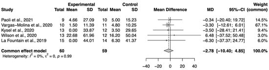 Five studies were included in the BP meta-analysis, with n = 60 in the experimental group and n = 59 in the control group. The effect size, mean difference, in the 1-RM was −2.78 (95%CI −10.40, 4.85) in favor of the control group; however, there were no significant differences (p > 0.05), as indicated in Figure 3.