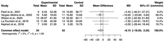 Regarding the meta-analysis of 1-RM in SQ, the effect size was in favor of the control group (n = 54), compared to the control group (n = 52) of −8.15 (95%CI −18.55, 2.24) with p > of 0.05 (Figure 4).